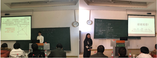 本次比赛分为两个环节,第一个环节是参赛选手展示,在规定的20分钟内完成授课教学,由几位评委现场打分。2016级数学与应用数学专业的五名参赛选手分别以“认识分式”、“等腰三角形及其性质”、“幂函数”、“集合间的基本运算”、“正方形之十字架问题”五个课题进行授课展示。每位选手都做了充足的准备,举手投足之间显现出自信和大方,教学语言严谨得当,表达清晰流利。