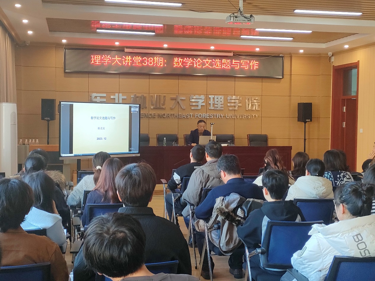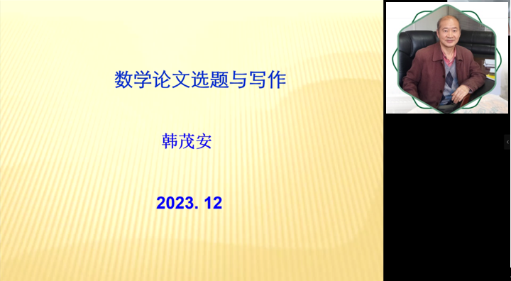 为落实立德树人根本任务,提升数学学科研究生科研水平与写作能力,伟德体育于2023年12月6日下午在锦绣楼407举办了“花开有声”第38期理学大讲堂,邀请浙江师范大学韩茂安教授做了关于数学论文选题与写作的讲座。讲座由经理安勇教授主持,数学系全体教职工、数学学科所有研究生参会。