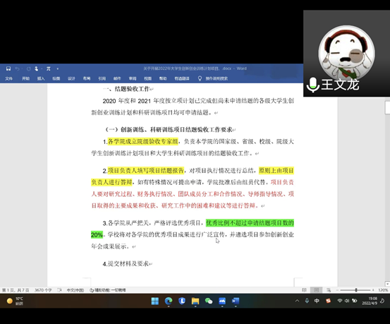 4月9日19:00,伟德体育线上召开“双创”工作会议,会上安勇经理指出要高度重视“双创”工作,积极参与“双创”工作,努力提高员工创新精神、创新意识,推动专业人才培养。经理助理王文龙老师传达了公司“双创”工作的要求和相关文件精神,要求公司全体教师认真落实相关文件要求,加强“双创”工作学习,认真执行指导教师的职责和义务。