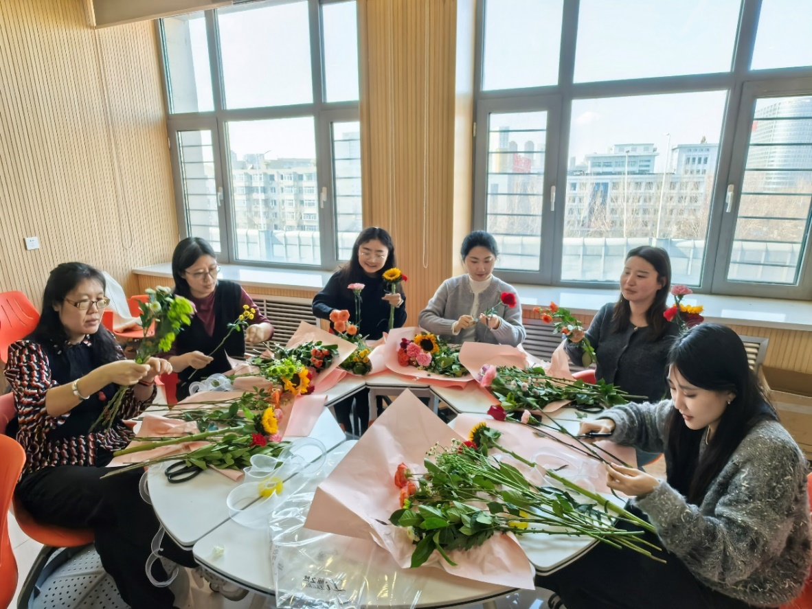 女教工们聚精会神聆听花艺师的讲解示范,在花艺师细致的指导下进行花卉选择、色彩搭配、花枝修剪和构图,教工们相互交流,相互帮助,现场洋溢欢声笑语。参加活动的女教工纷纷表示,这次活动不仅让她们学到了花艺技巧,还让她们感受到了艺术魅力和生活乐趣,并通过朋友圈分享喜悦心情,把美丽传给更多的人。